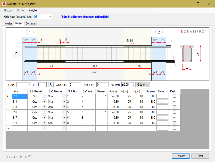 Kiriş veri girişi arayüzünü incelemek