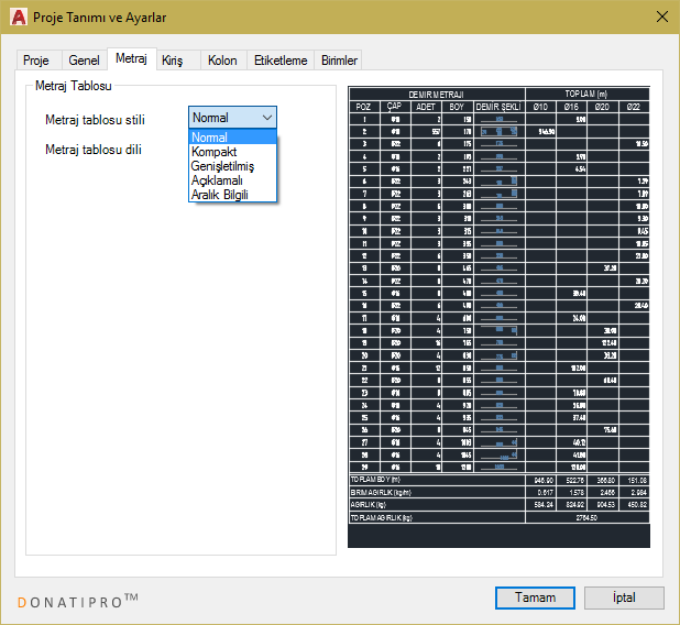 Hayır! Donatıpro™'nun içinde 10 değişik çeşit metraj tablosu vardır. Bu tabloların sayıları artırılabilir ve özelleştirilebilirler. Metraj tablosu tipleri.